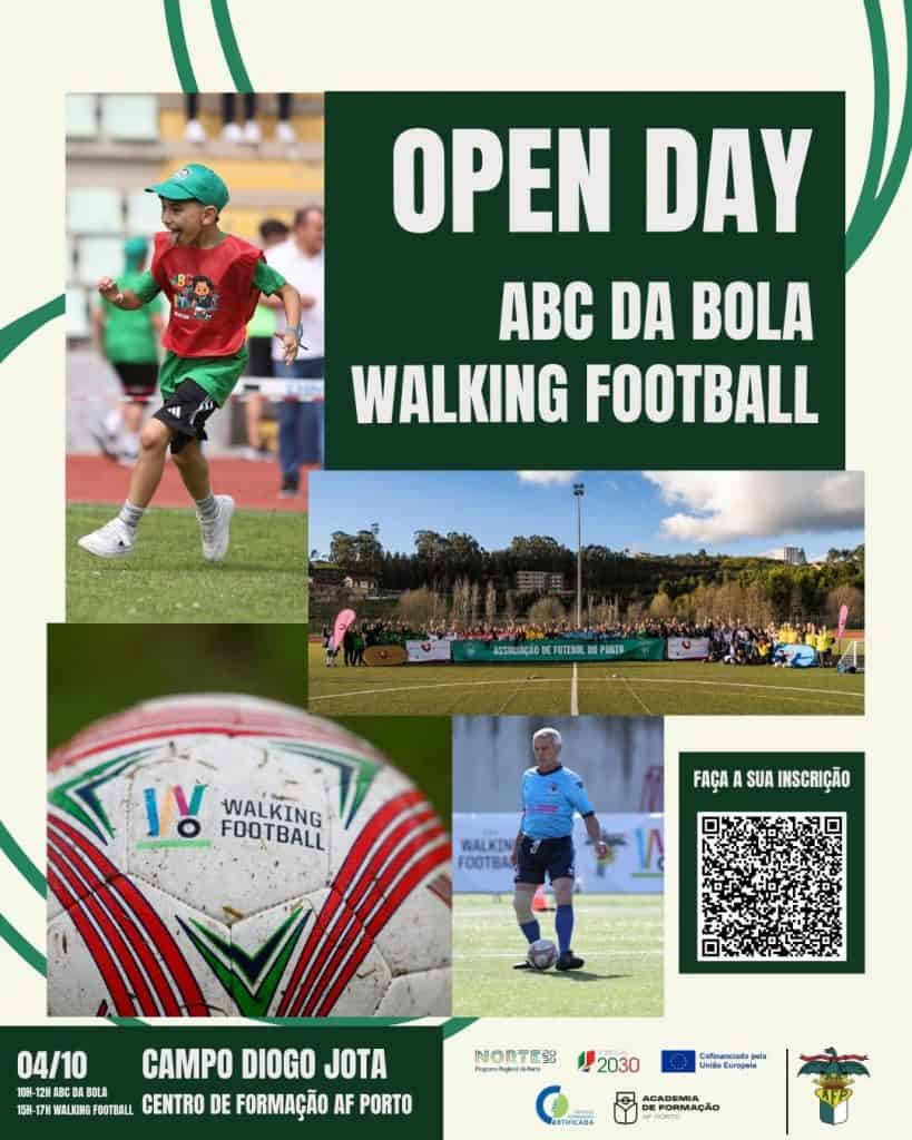 O Centro de Formação da Associação de Futebol do Porto (AF Porto) promove no próximo sábado, 4 de outubro, entre as 10h00 e as 17h00, o primeiro Open Day | Walking Football e ABC da Bola, no Campo Diogo Jota, situado na Prelada, Porto.