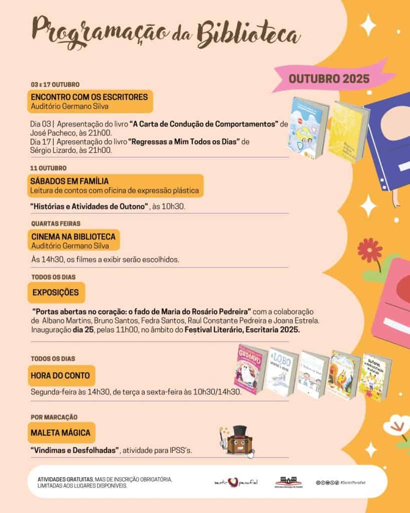 A Biblioteca Municipal de Penafiel divulgou a programação para o mês de outubro de 2025, que inclui encontros com escritores, sessões de cinema, oficinas, exposições e atividades para diferentes públicos.