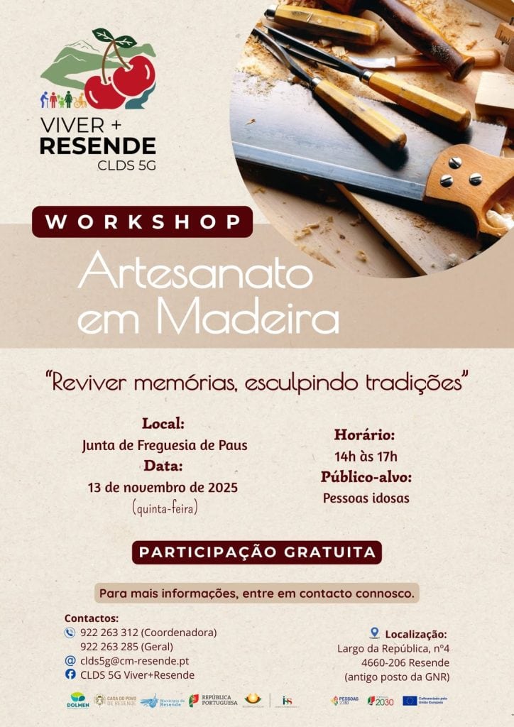 O projeto CLDS 5G Viver+Resende vai promover um workshop de “Artesanato em Madeira” na próxima quinta-feira, 13 de novembro de 2025.
